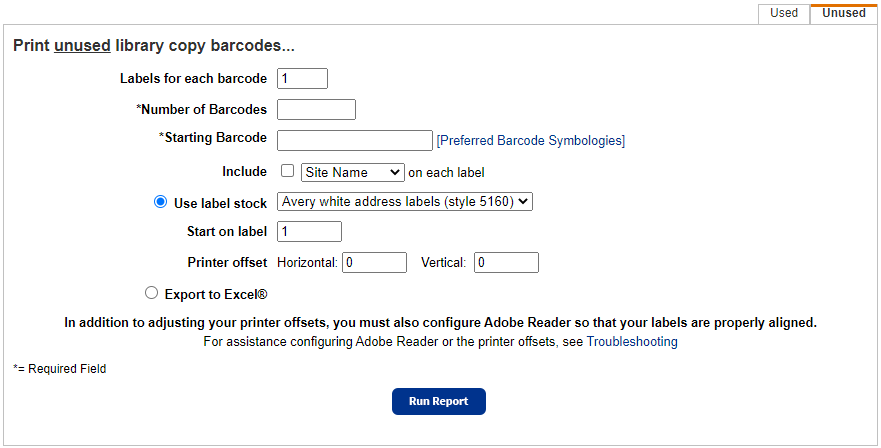 • To identify (and copy, if desired) the next available barcode number, click the symbology name next to the Starting Barcode field.